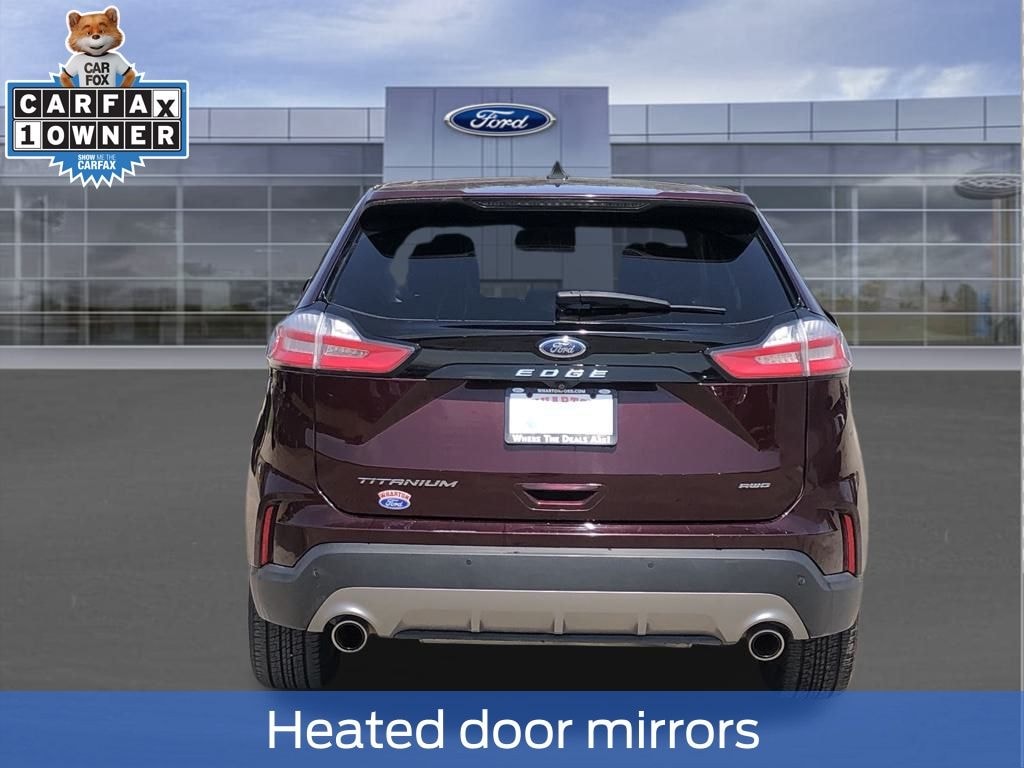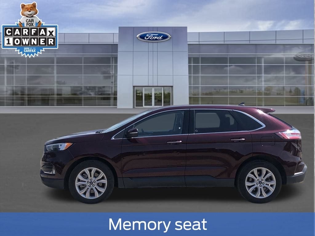 Burgundy Velvet Metallic Tinted Clearcoat 2022 Ford Edge Titanium AWD 8-Speed Automatic EcoBoost 2.0L I4 GTDi DOHC Turbocharged VCT AWD, Alloy wheels, Equipment Group 300A, Garage door transmitter, Heated door mirrors, Heated front seats, Heated steering wheel, Leather-Trimmed Heated Sport Bucket Seats, Memory seat, Power Liftgate, Power passenger seat, Wheels: 19" Luster Nickel-Painted Aluminum.