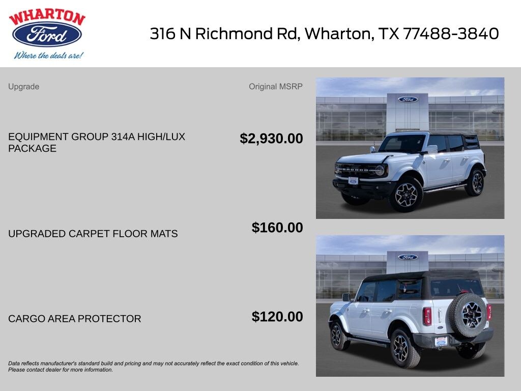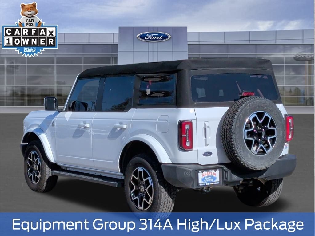 Certified. Oxford White 2024 Ford Bronco Outer Banks 4WD 10-Speed Automatic 2.3L EcoBoost I-4 1 OWNER, 10 Speakers w/Subwoofer, 18" Bright Machined Aluminum Wheels, 360-Degree Camera, Adaptive Cruise Control, Additional Sound Deadening, Alloy wheels, Cargo Area Protector, Equipment Group 314A High/Lux Package, Evasive Steering Assist, Front Parking Sensors, Heated Steering Wheel, Information on Demand Panel, Navigation system: Connected Navigation, Radio: B&O Sound System by Bang & Olufsen, Sideview Mirrors, Universal Garage Door Opener, Upgraded Carpet Floor Mats, Wireless Charging Pad.