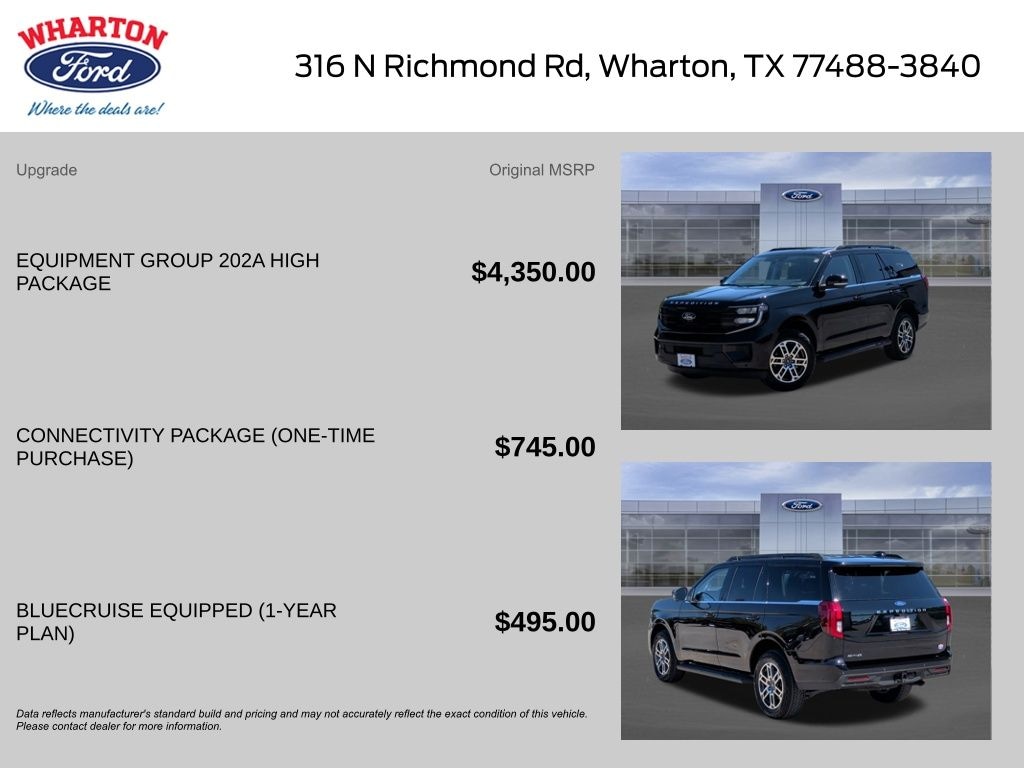 Connectivity Package (One-Time Purchase), Equipment Group 202A High Package (110V/400W AC Power Outlet, 26mm Engine Radiator, 2nd Row Power-Folding Captain's Chairs, 360-Degree Zone Lighting, 3rd Row Flexible Seating, 3rd Row Vinyl Seats, 4-Door Intelligent Access (Lock/Unlock), ActiveX Front Heated Captain's Chairs, BlueCruise Equipped, Flex Powered Console, Ford Split Gate, Front Side Laminated Glass, Heated Steering Wheel, Heavy-Duty Trailer Tow, Integrated Trailer Brake Control, Memory Driver Seat, Power Panoramic Vista Roof w/Power Sunshade, Power Tilt/Telescopic Steering Wheel w/Memory, Power-Folding Sideview Mirrors w/Autofold, Rain Sensing Wipers, SecuriCode Keyless Entry Pad, Universal Garage Door Opener, USB Ports, Wheels: 20" Carbonized Gray Bright Machined Aluminum, and Wireless Charging Pad), 4WD, 3.73 Axle Ratio, 3rd row seats: split-bench, 4-Wheel Disc Brakes, 6 Speakers, ABS brakes, Air Conditioning, Alloy wheels, AM/FM radio: SiriusXM with 360L, Apple CarPlay/Android Auto, Auto High-beam Headlights, Auto-dimming Rear-View mirror, Automatic temperature control, BlueCruise Equipped (1-Year Plan), Brake assist, Bumpers: body-color, Cloth Front Captain's Chairs, Compass, Delay-off headlights, Driver door bin, Driver State Detection, Driver vanity mirror, Dual front impact airbags, Dual front side impact airbags, Electronic Stability Control, Emergency communication system: 911 Assist, Exterior Parking Camera Rear, Four wheel independent suspension, Front anti-roll bar, Front Bucket Seats, Front Center Armrest, Front dual zone A/C, Front License Plate Bracket, Front reading lights, Fully automatic headlights, Heated door mirrors, Illuminated entry, Intersection Assist, Low tire pressure warning, Navigation System, Occupant sensing airbag, Outside temperature display, Overhead airbag, Overhead console, Panic alarm, Passenger door bin, Passenger vanity mirror, Power door mirrors, Power driver seat, Power passenger seat, Power steering, Power windows, Radio data system, Radio: AM/FM Stereo w/MP3 Capable, Rear air conditioning, Rear anti-roll bar, Rear reading lights, Rear window defroster, Rear window wiper, Reclining 3rd row seat, Remote keyless entry, Security system, SiriusXM w/360L, Speed control, Speed-sensing steering, Speed-Sensitive Wipers, Split folding rear seat, Spoiler, Steering wheel mounted audio controls, Tachometer, Telescoping steering wheel, Tilt steering wheel, Traction control, Trip computer, Variably intermittent wipers, Voltmeter, and Wheels: 18" Dark Alloy Painted Aluminum.