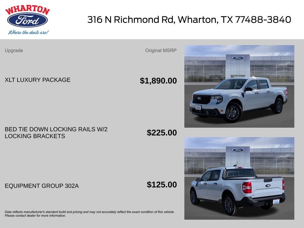 Equipment Group 302A, XLT Luxury Package (400W Inverter w/USB Console Rear, Heated Mirror w/Painted Black Skull Caps, Heated Seats, LED Box Lighting, Remote Start System, and Soft Vinyl Wrapped Heated Steering Wheel), 2.91 Axle Ratio, 4-Wheel Disc Brakes, 6 Speakers, ABS brakes, Air Conditioning, Alloy wheels, AM/FM radio: SiriusXM with 360L, Apple CarPlay/Android Auto, Auto High Beams, Auto High-beam Headlights, Automatic temperature control, Bed Tie Down Locking Rails w/2 Locking Brackets, Brake assist, Bumpers: body-color, Compass, Delay-off headlights, Driver door bin, Driver vanity mirror, Dual front impact airbags, Dual front side impact airbags, Electronic Stability Control, Emergency communication system: SYNC 4 911 Assist, Exterior Parking Camera Rear, Four wheel independent suspension, Front anti-roll bar, Front Bucket Seats, Front Center Armrest, Front reading lights, Fully automatic headlights, Illuminated entry, Knee airbag, Low tire pressure warning, Occupant sensing airbag, Outside temperature display, Overhead airbag, Overhead console, Panic alarm, Passenger door bin, Passenger vanity mirror, Power door mirrors, Power steering, Power windows, Pre-Collision Assist w/Automatic Emergency Braking, Radio data system, Radio: AM/FM Stereo w/6 Speakers, Rear anti-roll bar, Rear seat center armrest, Rear step bumper, Rear-View Camera, Remote keyless entry, Security system, SiriusXM w/360L, Speed control, Speed-sensing steering, Steering wheel mounted audio controls, SYNC 4 w/Enhanced Voice Recognition, Telescoping steering wheel, Tilt steering wheel, Traction control, Trip computer, Unique Cloth Front Bucket Seats, and Wheels: 17" Carbonized Gray Painted Aluminum. Price includes: $1000 - Black Friday Mega Bonus Cash. Exp. 12/01/2025 $1000 - Retail Customer Cash. Exp. 01/05/2026