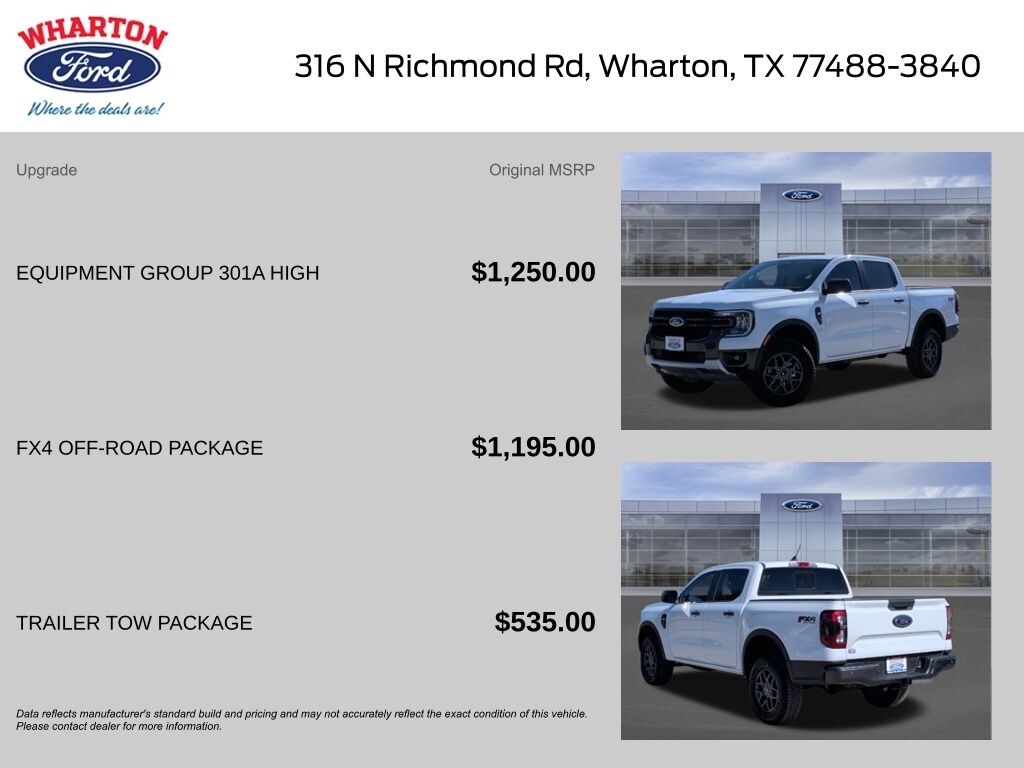 Equipment Group 301A High (12" Display in Center Stack, Dual-Zone Electronic Climate Control (DEATC), and Power-Sliding Rear Window), FX4 Off-Road Package (FX4 Off-Road Box Decal, FX4 Selectable Drive Modes, Off-Road Screen in Center Stack, Off-Road Tuned Shocks, and Trail Control), Sport Appearance Package (Gray Painted Center Bar & Grille Surround, Gray Painted Front Fascia & Rear Bumper, and Sport Box Decal), Trailer Tow Package (Class IV Trailer Hitch Receiver), 4WD, 4-Wheel Disc Brakes, 6 Speakers, ABS brakes, Air Conditioning, Alloy wheels, AM/FM radio: SiriusXM, AM/FM Stereo, Auto High-beam Headlights, Auto-dimming Rear-View mirror, Brake assist, Cloth Front Bucket Seats, Compass, Delay-off headlights, Driver door bin, Driver vanity mirror, Dual front impact airbags, Dual front side impact airbags, Electronic Stability Control, Emergency communication system: SYNC 4 911 Assist, Front anti-roll bar, Front Bucket Seats, Front Center Armrest, Front fog lights, Front License Plate Bracket, Front reading lights, Front wheel independent suspension, Fully automatic headlights, Illuminated entry, Internet access capable: FordPass Connect 4G, Leather Shift Knob, Low tire pressure warning, Navigation system: Connected Navigation, Occupant sensing airbag, Outside temperature display, Overhead airbag, Overhead console, Panic alarm, Passenger door bin, Passenger vanity mirror, Power door mirrors, Power steering, Power windows, Rear reading lights, Rear seat center armrest, Rear step bumper, Rear window defroster, Remote keyless entry, Security system, SiriusXM Satellite Radio, Speed control, Speed-sensing steering, Steering wheel mounted audio controls, SYNC 4A w/Connected Navigation, Telescoping steering wheel, Tilt steering wheel, Traction control, Trip computer, Variably intermittent wipers, Voltmeter, and Wheels: 17" Gray-Painted Aluminum. Price includes: $2000 - Bonus Customer Cash. Exp. 03/31/2026