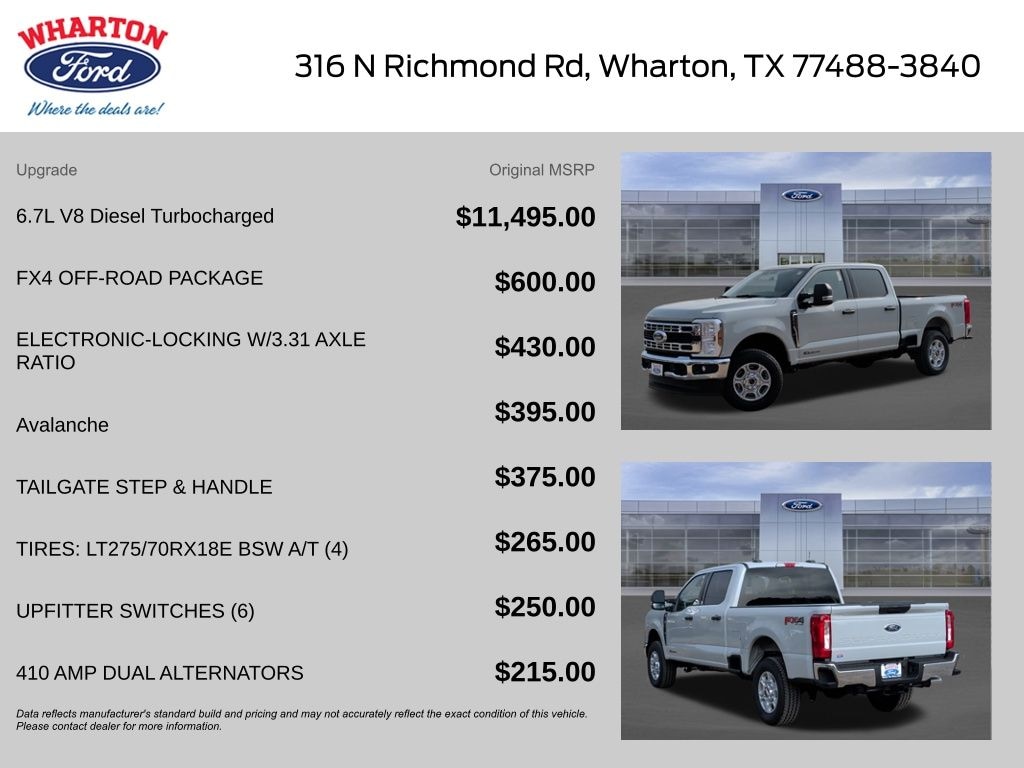 Ford Connectivity Package (1-Year Included), FX4 Off-Road Package (Hill Descent Control, Off-Road Specifically Tuned Shock Absorbers, and Unique FX4 Off-Road Box Decal), GVWR: 10,000 Lb Payload Package, Internet access capable: 5G Modem - Ford Connectivity Package, Order Code 603A (Cloth 40/20/40 Split Bench Seat, Radio: AM/FM Stereo with MP3 Player, SYNC 4, and Wheels: 18" Sparkle Silver Painted Cast Aluminum), 4WD, 4-Wheel Disc Brakes, 410 Amp Dual Alternators, 6 Speakers, ABS brakes, Air Conditioning, Alloy wheels, AM/FM radio, Auto High-beam Headlights, Brake assist, Bumpers: chrome, Compass, Delay-off headlights, Driver door bin, Driver vanity mirror, Dual AGM 68 AH Battery, Dual front impact airbags, Dual front side impact airbags, Electronic Stability Control, Emergency communication system: SYNC 4 911 Assist, Exterior Parking Camera Rear, Front anti-roll bar, Front Center Armrest w/Storage, Front fog lights, Front License Plate Bracket, Front reading lights, Fully automatic headlights, Heated door mirrors, Illuminated entry, Low tire pressure warning, Outside temperature display, Overhead airbag, Overhead console, Panic alarm, Passenger door bin, Passenger vanity mirror, Power door mirrors, Power driver seat, Power steering, Power windows, Privacy Glass, Rear reading lights, Rear step bumper, Remote keyless entry, Security system, Speed control, Split folding rear seat, Steering wheel mounted audio controls, Tachometer, Tailgate Step and Handle, Telescoping steering wheel, Tilt steering wheel, Traction control, Trip computer, Turn signal indicator mirrors, Upfitter Switches (6), and Variably intermittent wipers. Price includes: $1000 - Retail Customer Cash. Exp. 03/31/2026