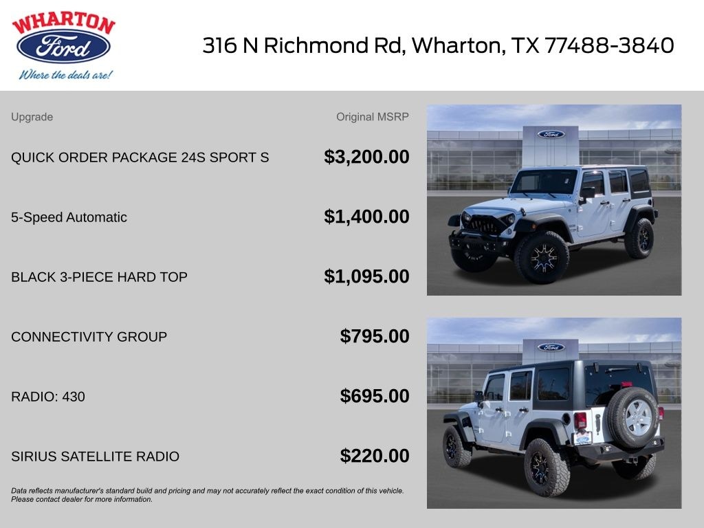 Bright White Clearcoat 2018 Jeep Wrangler JK Unlimited Sport 4WD 5-Speed Automatic 3.6L V6 24V VVT WHEELS, FRONT & REAR BUMPERS, 65K ACTUAL MILES, 1-Yr SiriusXM Radio Service, 17" x 7.5" Aluminum Wheels, Auto-Dimming Mirror w/Reading Lamp, Body Color 3-Piece Hard Top, Chrome/Leather Wrapped Shift Knob, Connectivity Group, Deep Tint Sunscreen Windows, Front 1-Touch Down Power Windows, Leather Wrapped Steering Wheel, Power Convenience Group, Power Heated Mirrors, Power Locks, Quick Order Package 24S Sport S, Radio: 430, Remote Keyless Entry, Remote USB Port, Security Alarm, Tire Pressure Monitoring Display, Uconnect Voice Command w/Bluetooth, Vehicle Information Center.